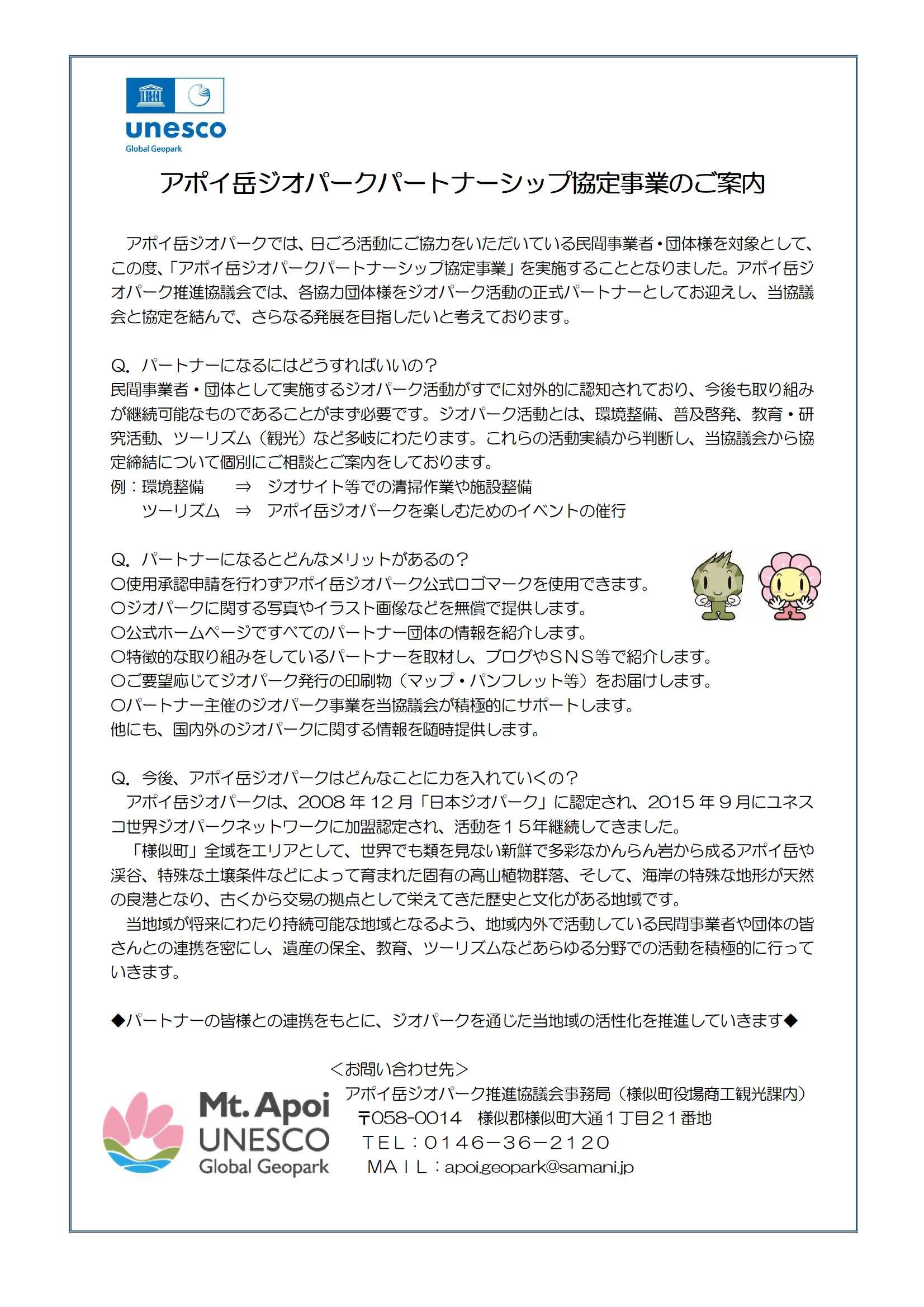 アポイ岳ユネスコ世界ジオパークでは、ジオパークの活動を実践する地域の団体や企業をジオパーク・パートナーとして団体(企業)を募集しています。