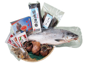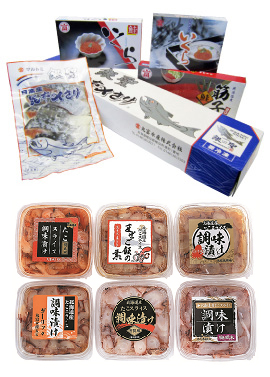 - 真つぶ、まつも、日高昆布、ホッキ貝、灯台つぶボイル、毛ガニ、マツカワ、カキ、アサリ、ホッキ、白貝、秋鮭の山漬、新巻鮭(銀聖)、イクラのしょうゆ漬、まぜごはんの素(ホタテ・つぶ・サケ)