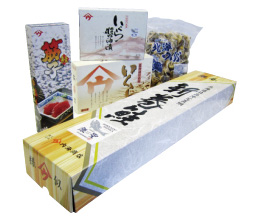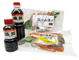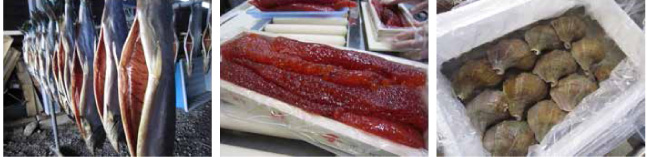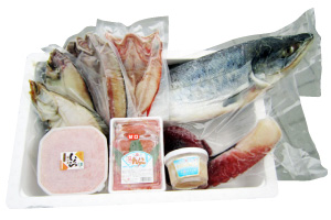 - さけ加工品(銀聖・山漬け・新巻鮭、いくら醤油漬・筋子など)、日高昆布、真ツブ、タラコ、干物(きんきん・かれい・ほっけなど)、鮮魚