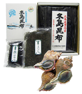 - 日高昆布(冬島産・えりも産)、干しふのり、干しまつも、真ツブ、灯台ツブ、毛ガニなど